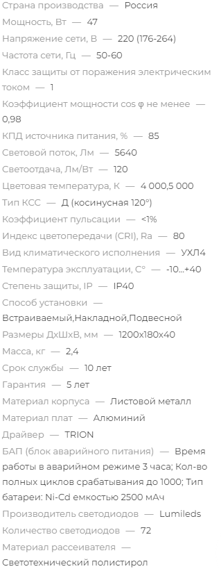 Обладает энергоэффективностью 120 Лм/Вт. Корпус выполнен из листового металла, окрашенного белой порошковой краской. Гарантия 5 лет, степень защиты IP40. Крепление светильника встраиваемый, на подвесах, либо накладной. Комплектуется прозрачным призматическим рассеивателем или матовым. Модельный ряд от 18 Вт до 80 Вт.